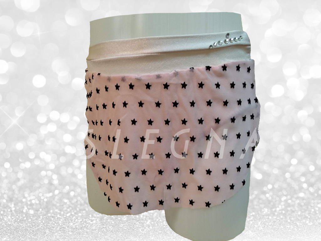 Faldita de patinaje de tul rosa pastel con estrellitas negras combinada con lycra lisa rosa pastel y con cubrepatines de lycra rosa pastel a juego.