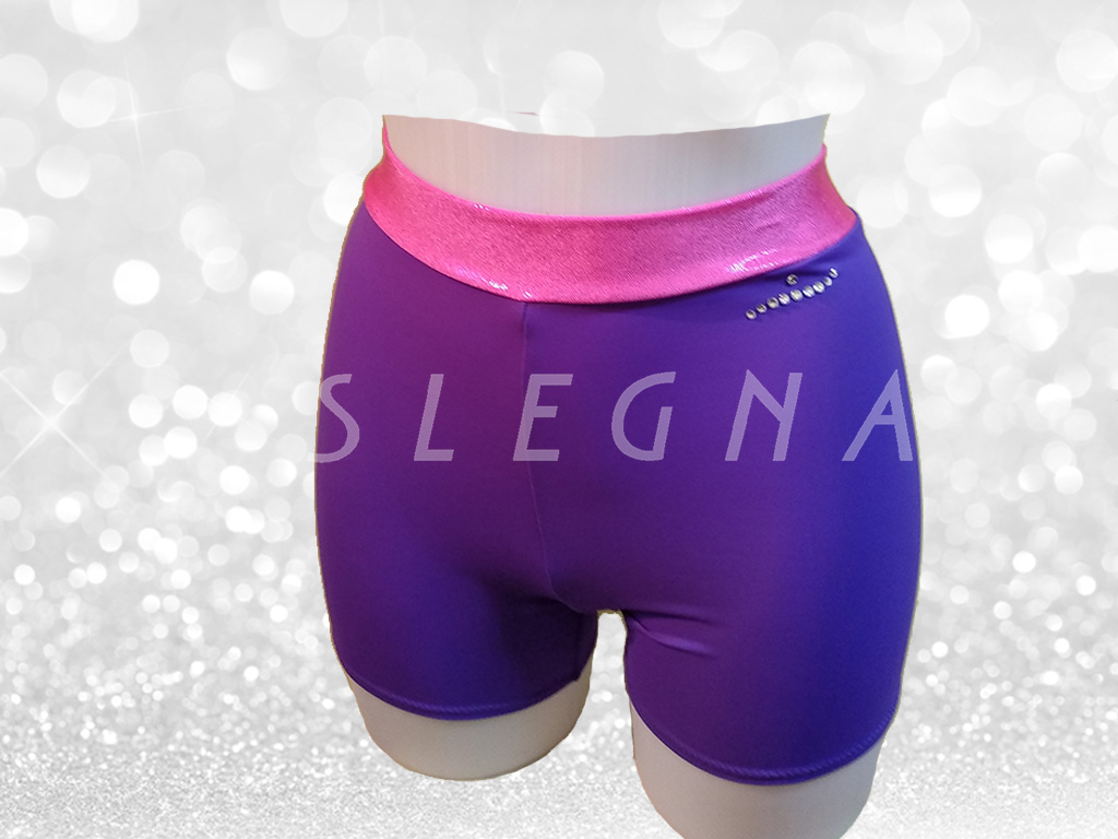 Shorts de lycra lisa morada con ribete lycra mystique rosa.
