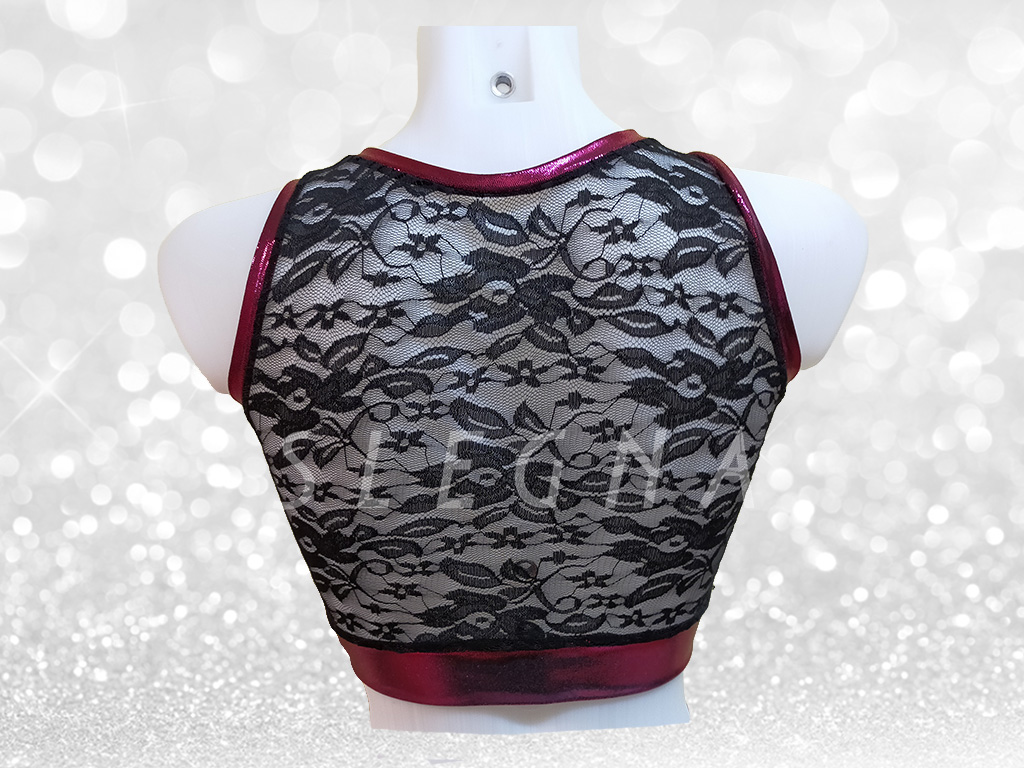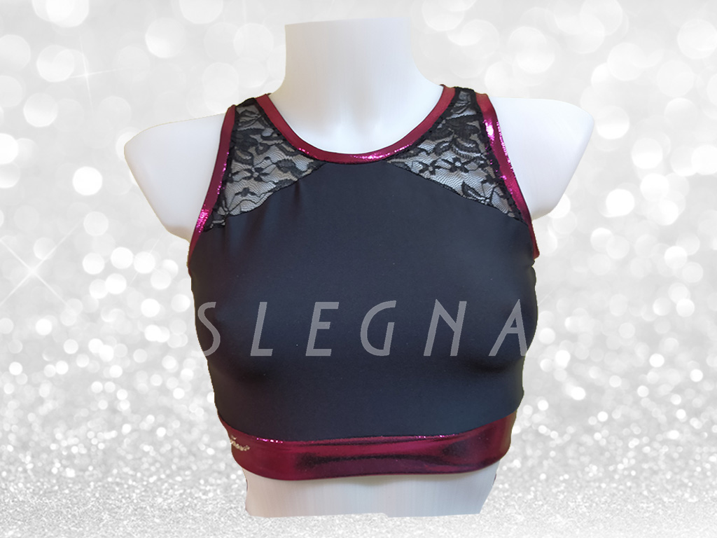 Top corto sin mangas de lycra negra, con hombros y espalda de encaje negro, con ribete lycra mystique rosa oscuro.
